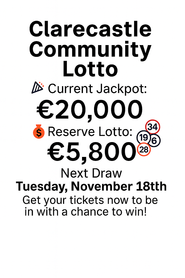 Clarecastle Community Lotto Draw will take place tomorrow Tuesday November 18th and you will be playing for the €20,000 Jackpot.