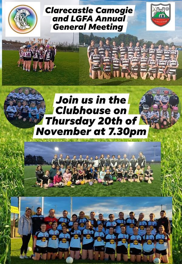 Reminder: Spare an hour for the Camogie and LGFA AGM tomorrow, Thursday 20th November at 7.30pm in the Clubhouse.