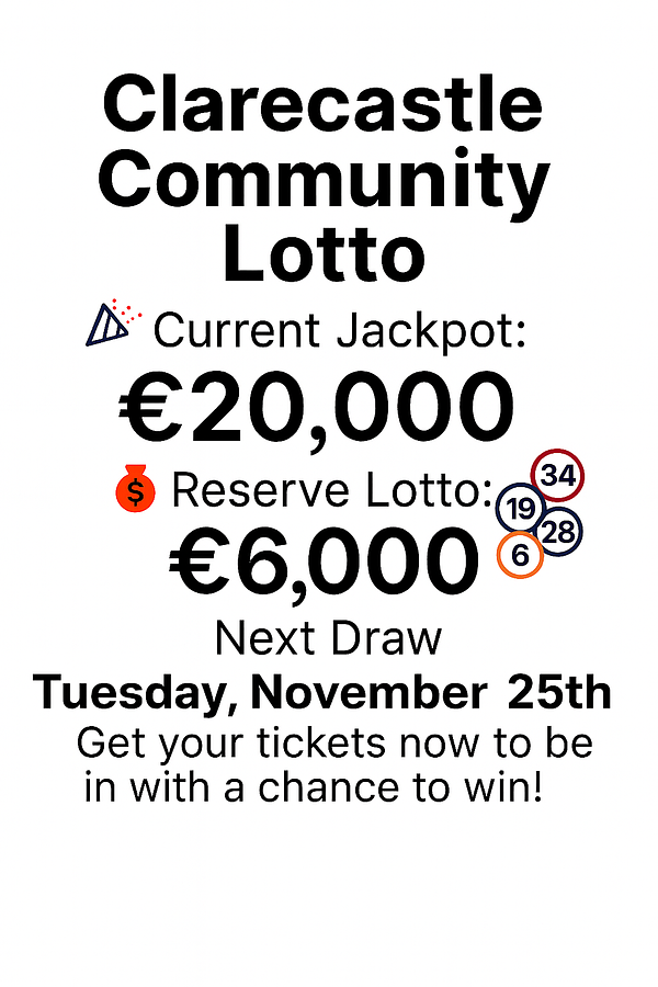Clarecastle Community Lotto Draw will take place tomorrow Tuesday November 25th and you will be playing for the €20,000 Jackpot.