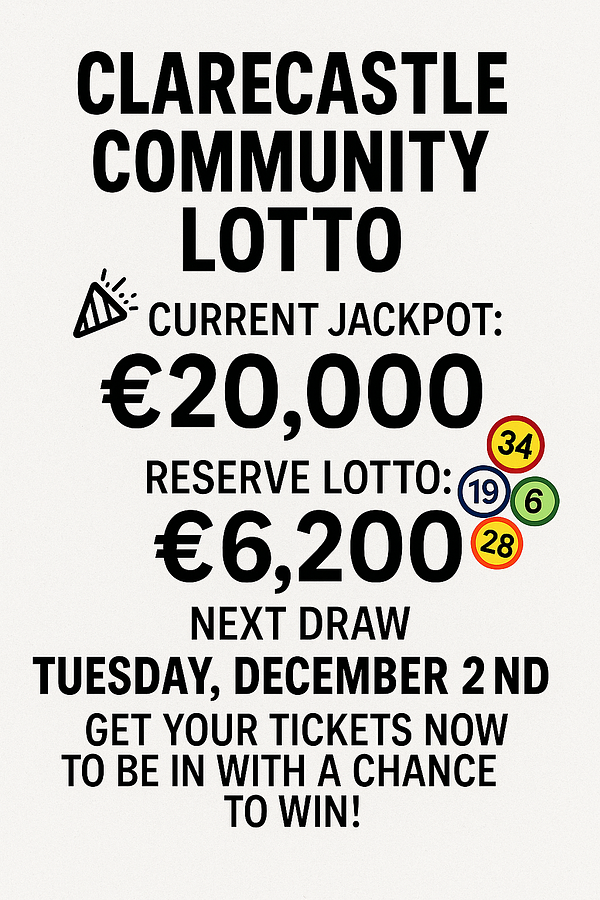 Clarecastle Community Lotto Draw will take place tomorrow Tuesday November 25th and you will be playing for the €20,000 Jackpot.