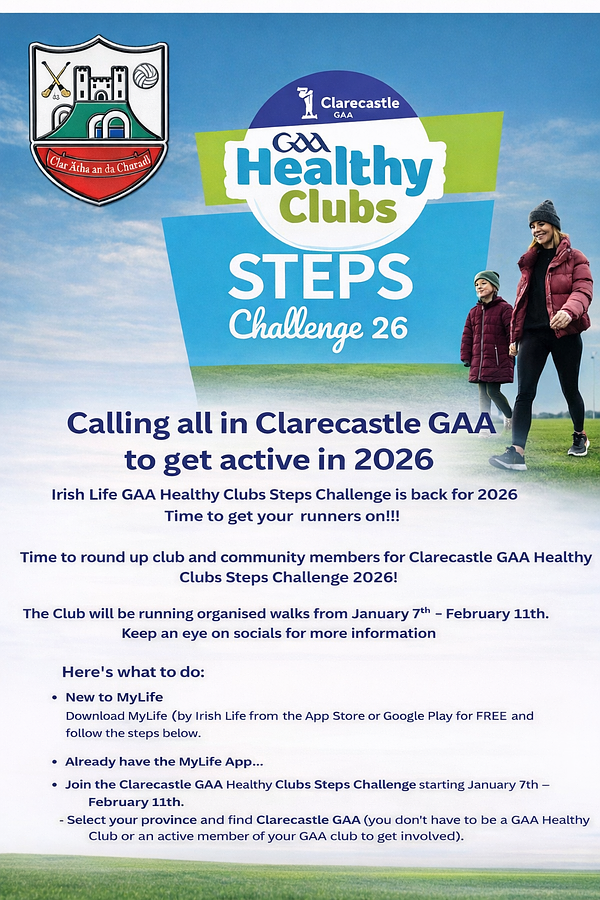Track your steps using the MyLife by Irish Life app and help Clarecastle GAA climb the leaderboard. Steps logged contribute to the club total.
