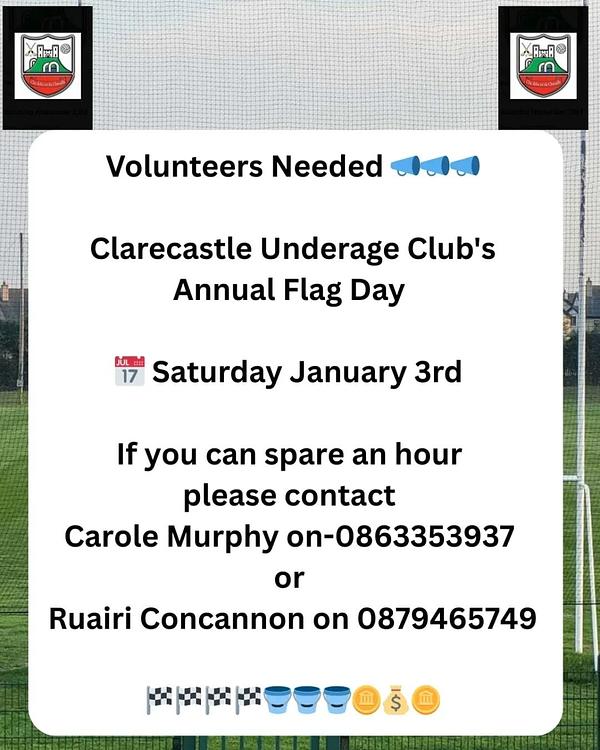 Clarecastle Underage Clubs annual flag day takes place around Ennis town on Saturday 3rd January. We are looking for club members to give 1 hour of their time collecting for our club. If you are available on 3rd January please contact Carole Murphy on 0863353937 or Ruairi Concannon on 0879465749