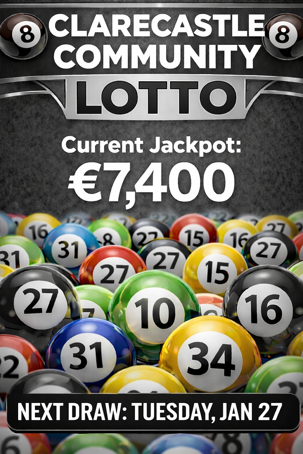 Clarecastle Community Lotto Draw will take place Tuesday January 27 and you will be playing for the €7,400 Jackpot.
