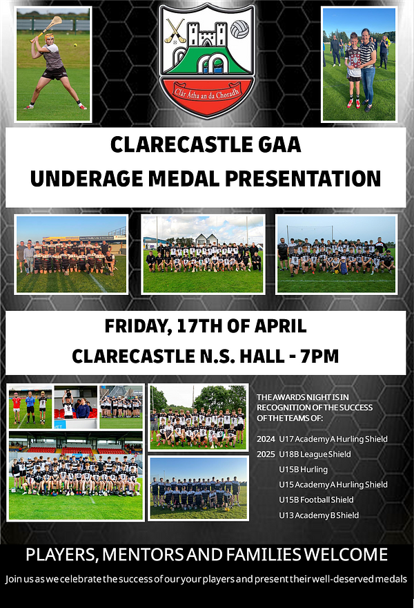 Our U-18s, U-17s, U-15s and U-13s will all be honoured at a medal presentation in Clarecastle National School at 7pm on April 17th.