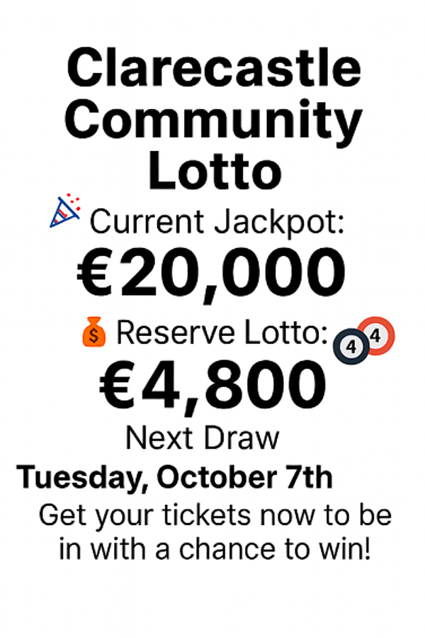 Clarecastle Community Lotto Draw will take place tomorrow Tuesday October 7th and you will be playing for the €20,000 Jackpot.
