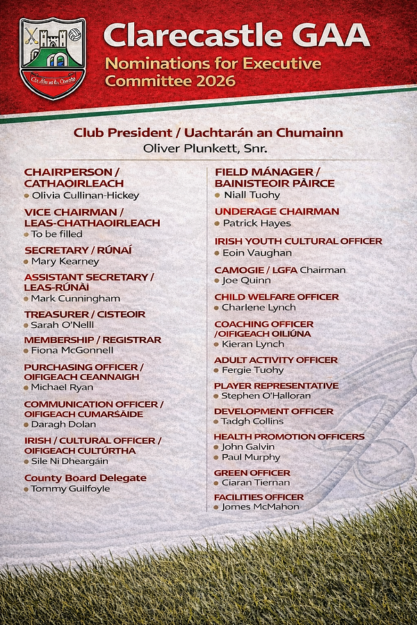Clarecastle GAA would like to congratulate all members of our newly appointed Executive Committee for 2026. We wish everyone every success in their roles for the year ahead.